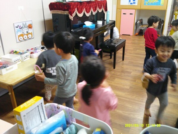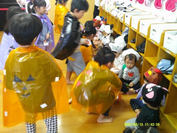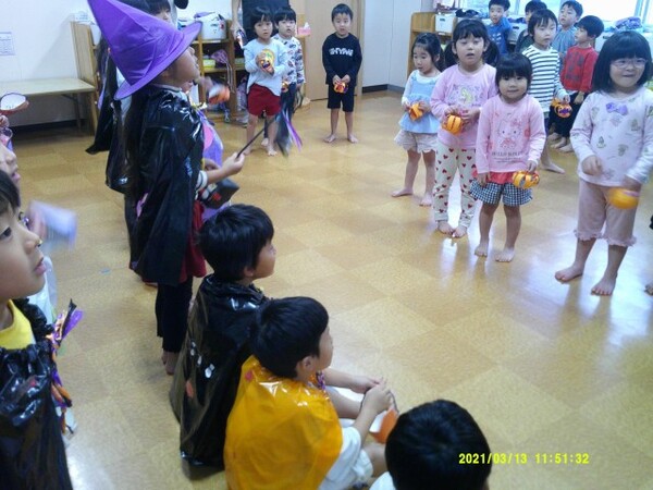 10/31 ハロウィン パーティーをしました。 年長児のお友達が手作りのマントに身を包み、沢山のキャンディーを準備して0歳から4歳のお友達のクラスを回って配りました。心がこもったキャンディーを頂きとても嬉しいでした。ゲーム遊び等も行い楽しい一日となりました。