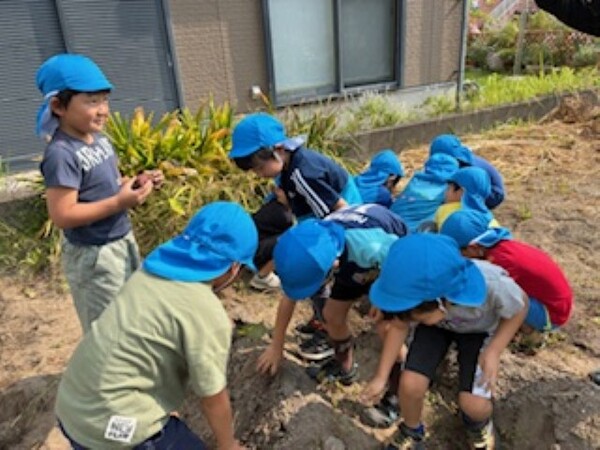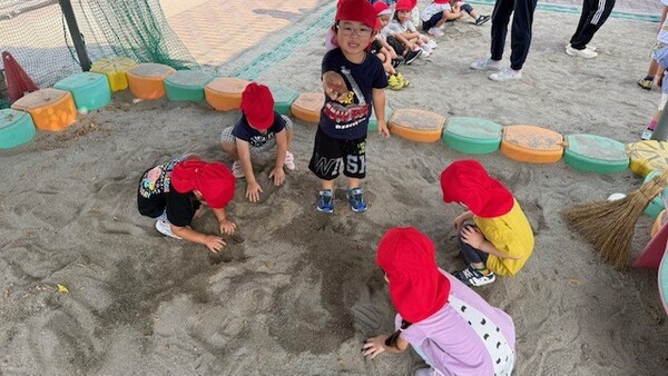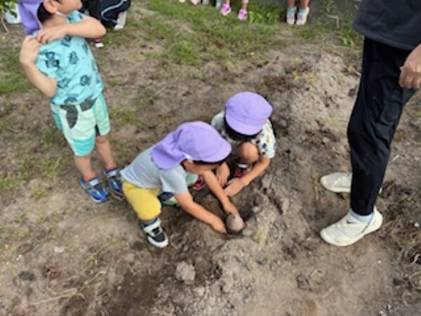 10/16 芋ほりを例年お世話なっている畑のお芋は不作の為、園の畑で行いました。お芋が出てくるまでは、どんな芋がどれくらい実っているかドキドキしましたが、おいしそうなお芋が沢山とれました。その後、年中・年長組は公園に行きおやつを食べたり遊具で遊んだり、楽しい時間を過ごしました。